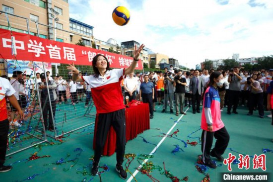 圖為郎平為陳經(jīng)綸中學(xué)首屆“郎平杯”排球聯(lián)賽開球!≈行律缬浾 富田 攝