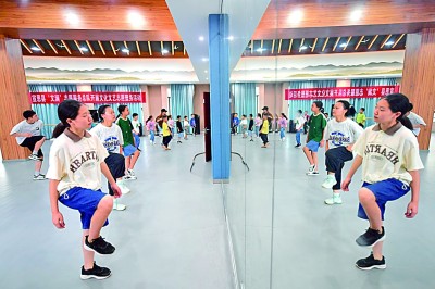 暑假期間,各地組織豐富的活動,讓孩子們的假期生活多姿多彩。圖為8月2日,孩子們在湖北省宣恩縣文化館練習(xí)舞蹈基本功。新華社發(fā)(宋文攝)