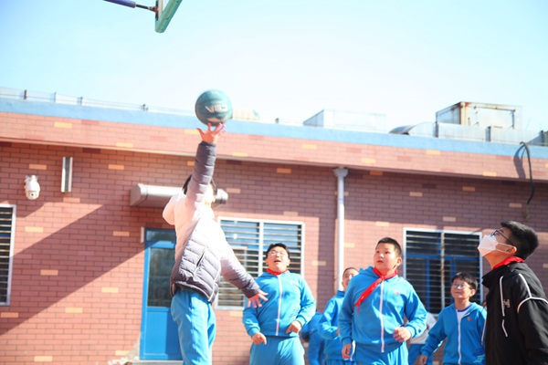 東四七條小學(xué)的學(xué)生課間在操場(chǎng)上打籃球。
