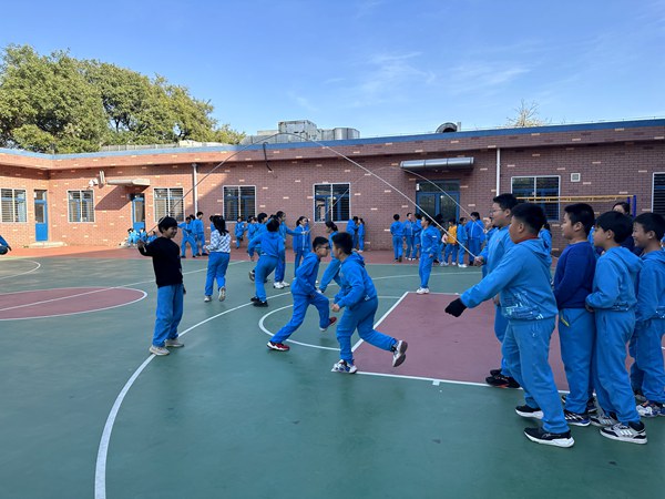 東四七條小學(xué)的學(xué)生課間在操場(chǎng)上跳長(zhǎng)繩。