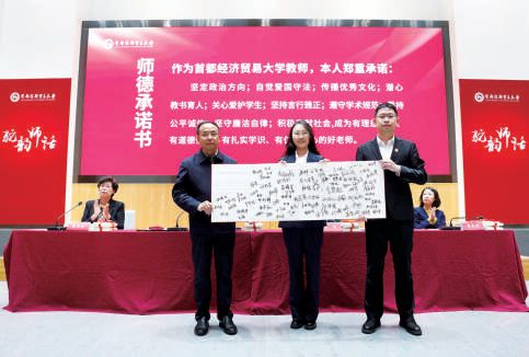 在加強思想政治建設(shè)方面,抓好思政課改革創(chuàng)新,在市屬高校率先全面開設(shè)“習(xí)近平新時代中國特色社會主義思想概論”課,獲批北京市首批重點建設(shè)馬克思主義學(xué)院。持續(xù)開展課程思政建設(shè),得到市委教育工委的肯定性評價。聯(lián)動社會大課堂,成立大學(xué)生思想政治教育中心,與北大紅樓、中國人民抗日戰(zhàn)爭紀(jì)念館、長辛店二七紀(jì)念館等單位共建一批“大思政課”實踐教學(xué)基地。堅持“五育并舉”,促進(jìn)學(xué)生全面發(fā)展。五年多來,學(xué)校獲評多項教育部和北京市課程思政建設(shè)獎項、北京高!叭恕眱(yōu)秀成果、北京高校“十佳輔導(dǎo)員”等榮譽。一批學(xué)生在文體比賽中獲省部級及以上獎勵,展現(xiàn)出新時代首經(jīng)貿(mào)學(xué)子的良好風(fēng)貌。