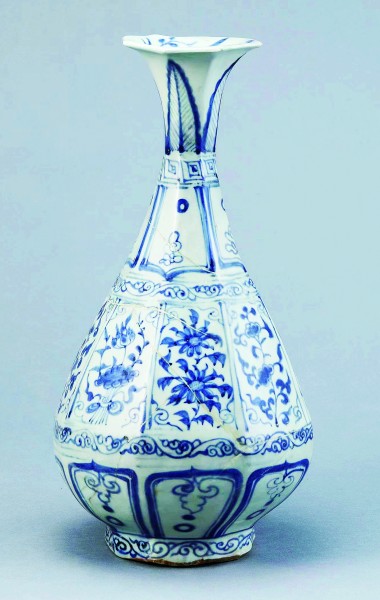 “北京大學(xué)藏古代外銷(xiāo)瓷”特展上的展品景德鎮(zhèn)窯青花折枝花卉紋八方玉壺春瓶。資料圖片