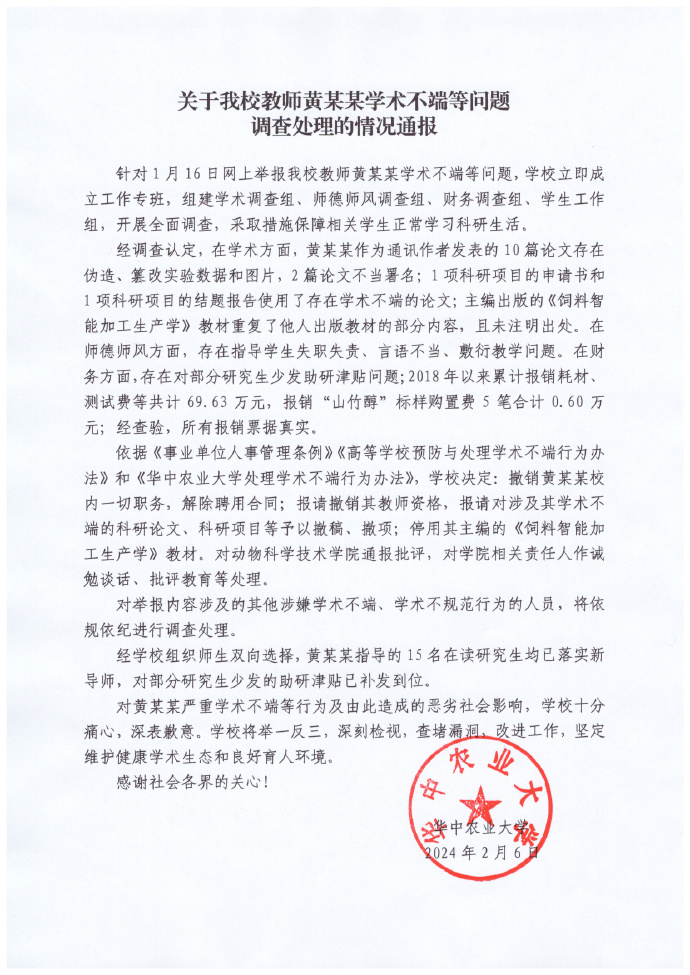 人民網(wǎng)北京2月6日電 (記者郝孟佳)今天,華中農(nóng)業(yè)大學(xué)在其官方微博通報教師黃某某學(xué)術(shù)不端等問題調(diào)查處理情況。通報稱,依據(jù)《事業(yè)單位人事管理條例》《高等學(xué)校預(yù)防與處理學(xué)術(shù)不端行為辦法》和《華中農(nóng)業(yè)大學(xué)處理學(xué)術(shù)不端行為辦法》,學(xué)校決定撤銷黃某某校內(nèi)一切職務(wù),解除聘用合同;報請撤銷其教師資格,報請對涉及其學(xué)術(shù)不端的科研論文、科研項目等予以撤稿、撤項;停用其主編的《飼料智能加工生產(chǎn)學(xué)》教材。