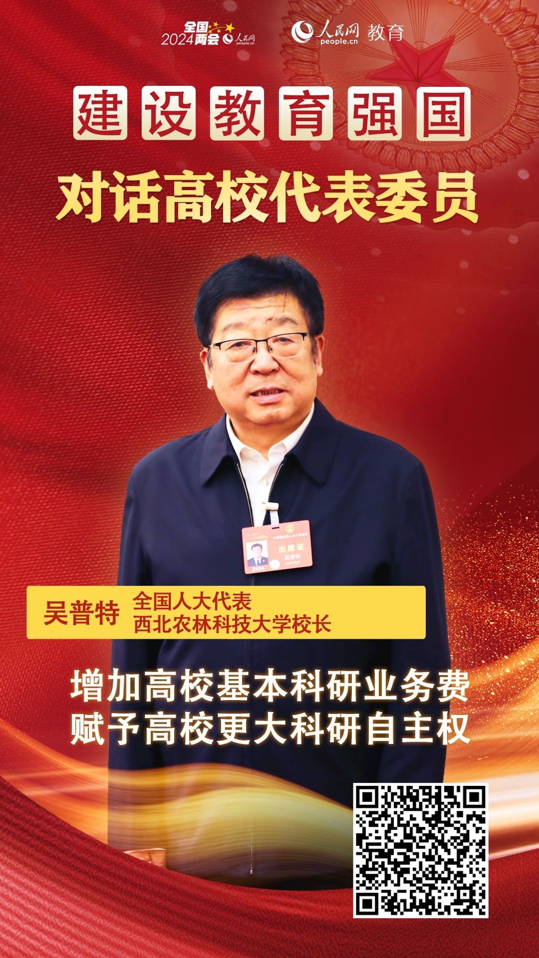 “高校是我國基礎(chǔ)研究的主力軍和重大科技突破的策源地。我建議在國家科技經(jīng)費(fèi)預(yù)算中大幅增加中央部屬高;究蒲袠I(yè)務(wù)費(fèi)預(yù)算,并向農(nóng)業(yè)高校、中西部高校傾斜!痹诮衲甑娜珖鴥蓵希珖舜蟠,西北農(nóng)林科技大學(xué)校長吳普特提交了《關(guān)于增加高校基本科研業(yè)務(wù)費(fèi)的建議》。