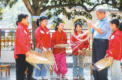 貴州省黔西市組織非遺傳承人及相關(guān)專業(yè)人員走進(jìn)校園,現(xiàn)場演示、教授竹編等技藝,讓學(xué)生們在實踐體驗中感受傳統(tǒng)手工藝的魅力。圖為黔西市雨朵鎮(zhèn)雨化小學(xué)學(xué)生在學(xué)習(xí)竹編技藝。
