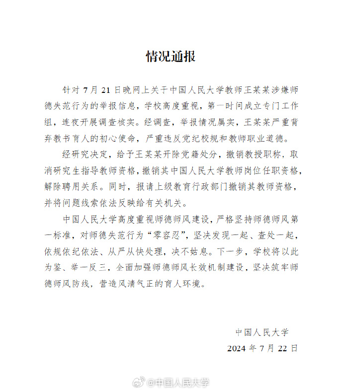 通報(bào)中稱(chēng),學(xué)校高度重視,第一時(shí)間成立專(zhuān)門(mén)工作組,連夜開(kāi)展調(diào)查核實(shí)。經(jīng)研究決定,給予王某某開(kāi)除黨籍處分,撤銷(xiāo)教授職稱(chēng),取消研究生指導(dǎo)教師資格,撤銷(xiāo)其中國(guó)人民大學(xué)教師崗位任職資格,解除聘用關(guān)系。同時(shí),報(bào)請(qǐng)上級(jí)教育行政部門(mén)撤銷(xiāo)其教師資格,并將問(wèn)題線索依法反映給有關(guān)機(jī)關(guān)。