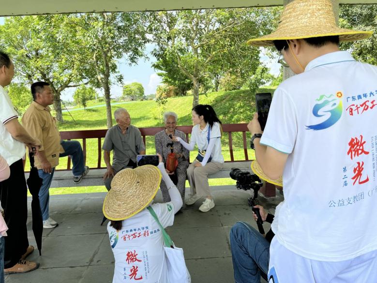 “微光”公益支教團(tuán)直播采訪建庫(kù)開(kāi)河的親歷者。學(xué)校供圖