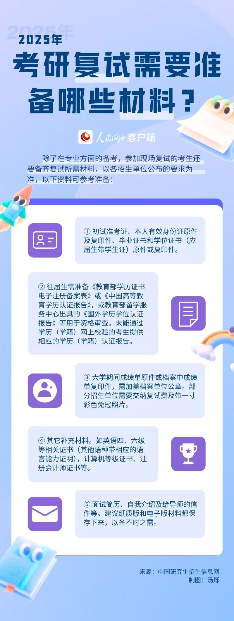 那么,考研復(fù)試有哪些主要流程?考生注意準(zhǔn)備哪些材料?人民網(wǎng)對相關(guān)信息進(jìn)行了梳理,以供考生參考。(李依環(huán)、實習(xí)生湯爍、實習(xí)生高云晴)