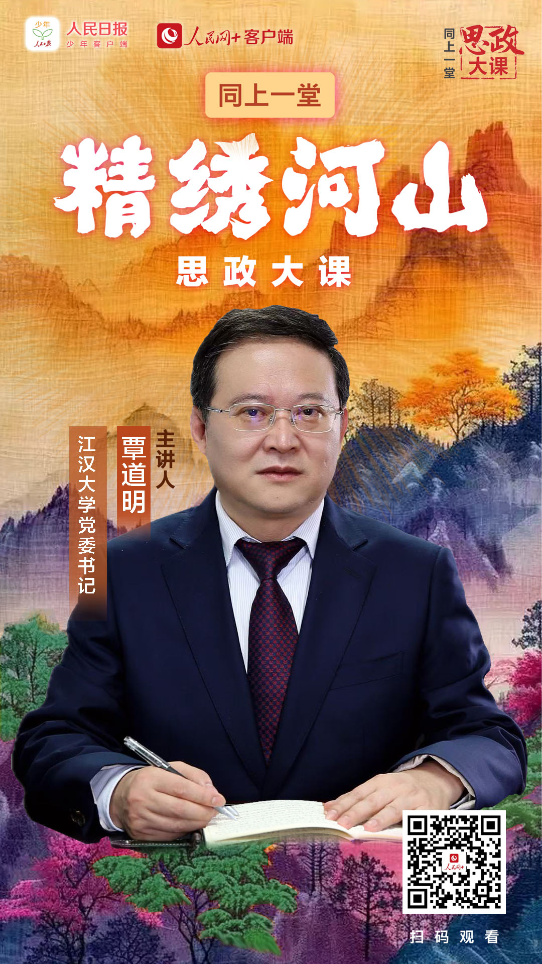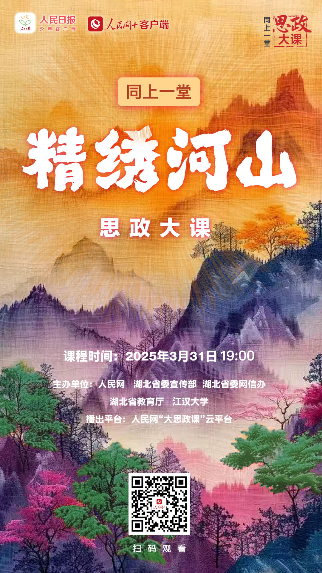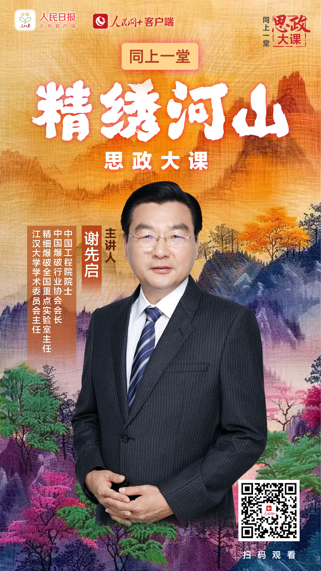 3月31日 19:00,同上一堂“精繡河山”思政大課。聽中國(guó)工程院院士、中國(guó)爆破行業(yè)協(xié)會(huì)會(huì)長(zhǎng)、江漢大學(xué)學(xué)術(shù)委員會(huì)主任謝先啟,江漢大學(xué)黨委書記覃道明,江漢大學(xué)馬克思主義學(xué)院副院長(zhǎng)、教授陳菲,講述科學(xué)家們?cè)诰?xì)爆破的科研與實(shí)踐中,為實(shí)現(xiàn)高水平科技自立自強(qiáng)接續(xù)奮斗的故事。