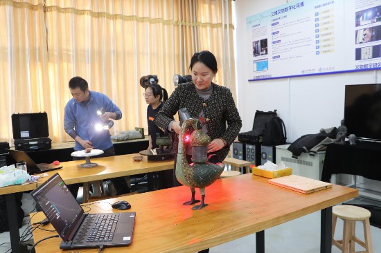 文物數(shù)字研究中心成員運(yùn)用三維掃描技術(shù)對(duì)文物展開數(shù)字掃描