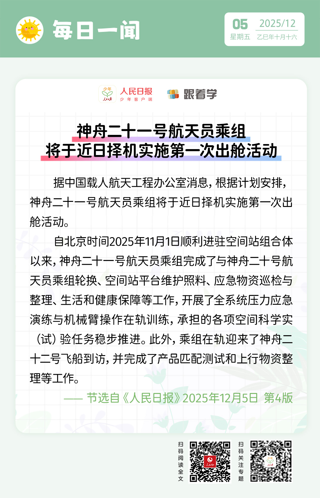 每日一聞丨神舟二十一號(hào)航天員乘組將于近日擇機(jī)實(shí)施第一次出艙活動(dòng)