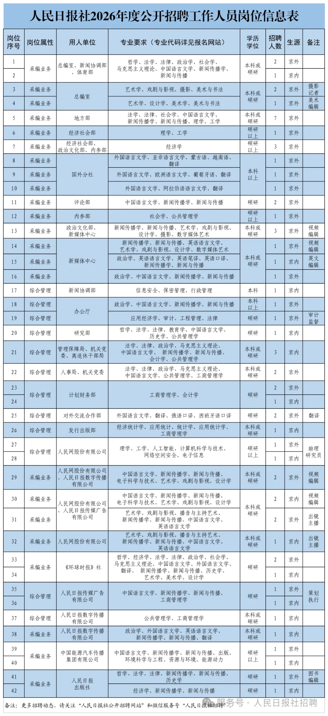 根據(jù)事業(yè)發(fā)展需要,人民日?qǐng)?bào)社2026年度面向國(guó)內(nèi)高校應(yīng)屆畢業(yè)生和海外留學(xué)人員公開(kāi)招聘工作人員64名?,F(xiàn)將有關(guān)事項(xiàng)公告如下。